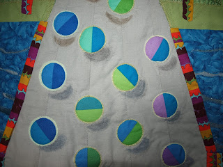 Als laatste het blauw van de achtergrond doorgequilt op de hand. in de bovenste strook heb ik de verfvlekken gevolgd en bij de 3 stroken er onder naar beneden steeds meer de vormen volgend gequilt.