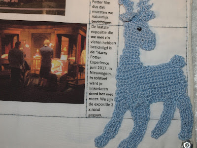 Bladzijde Harry Potter. Al voordat het in Nederland bekend was las je als 11 jarige in de vakantie de pocket van de 1e Harry Potter. Met hulp van woordenboek. Alleen cauldrum stond er niet in. Hele vakantie ons afgevraagd wat dat toch was. Later alle mogelijke filmlocaties bezocht. Je had gezegd dat je ook het hert als patronium had willen hebben dus die heb ik nu voor hem gehaakt.