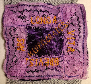 geborduurde letters op paars kant en fluweel